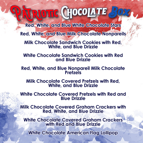 Whether you're sharing with friends and family at a July 4th BBQ, gifting it to a veteran, or treating yourself, the Patriotic Chocolate Box brings the perfect blend of festivity and flavor to your celebration. Order yours today and enjoy a sweet taste of Americana!